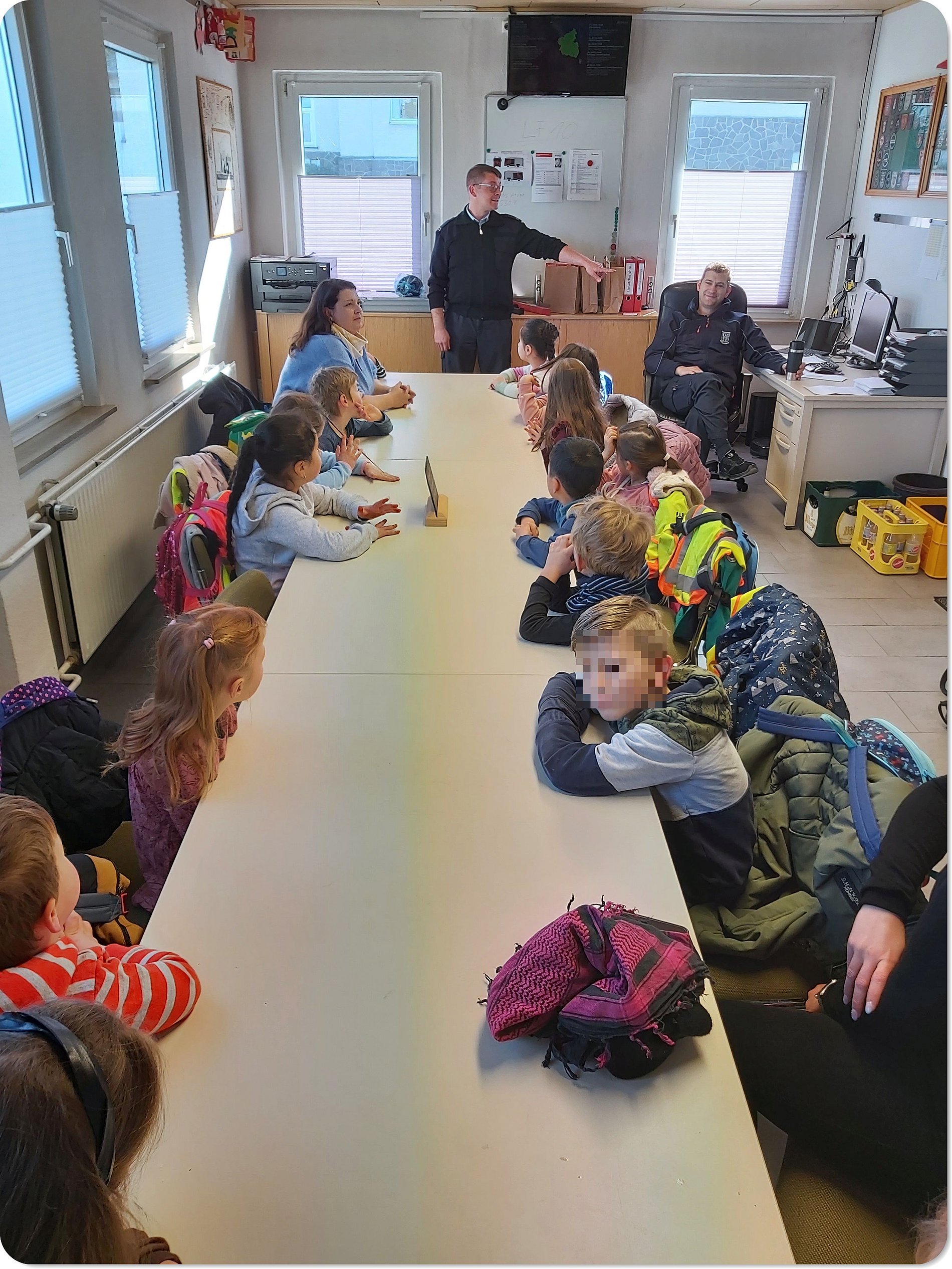 Darüber hinaus lernten die Kinder auch etwas über Spurensicherung, als der Polizist ihnen zeigte, wie Fingerabdrücke genommen und Spuren mit Puder markiert werden. Diese zusätzliche Aktivität gab den Kindern die Möglichkeit, mehr über forensische Arbeit und die Bedeutung von Beweisen in der Kriminalistik zu erfahren.