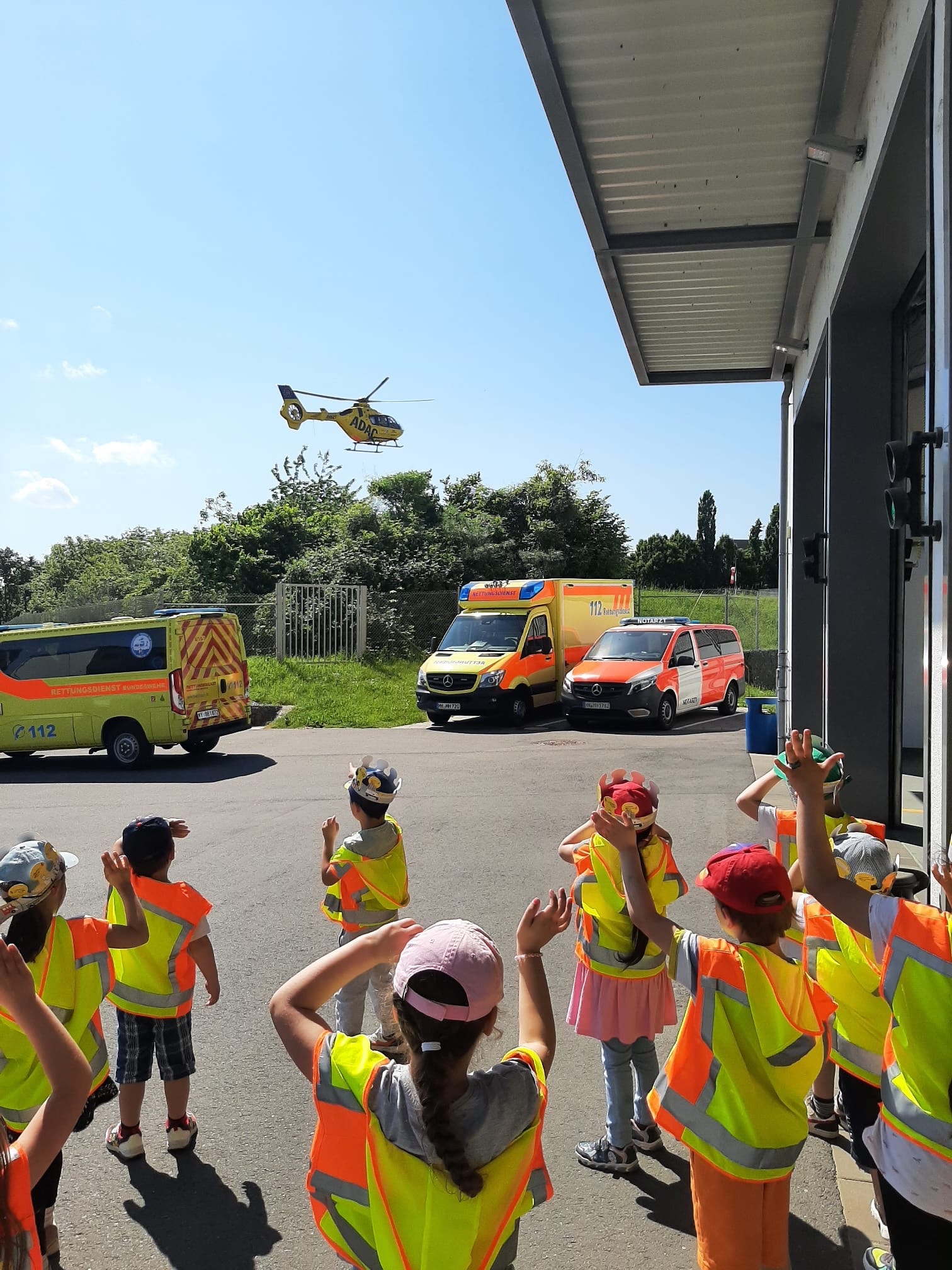 Anschließend wurden wir von sehr netten, geduldigen und engagierten Rettungssanitätern in der großen Fahrzeughalle empfangen. Die Kinder konnten sich verschiedene Rettungsfahrzeuge anschauen und durften die Ausstattung testen. Nachdem jedes Kind auf der Trage in den Rettungswagen geschoben wurde, gab es noch ein leckeres Mittagessen mit Würstchen im Brötchen und Nachtisch. Dabei konnten wir beobachten, wie der Hubschrauber von seinem Einsatz zurückkam und landete. Zum Schluss ging es mit dem Bus wieder nach Hillscheid in die Kita. Wir bedanken uns sehr bei der Fam.Stein, die uns und ihrem Enkel diesen lehrreichen und spannenden Ausflug auf das BwZK Gelände, durch ihre Kontakte,  ermöglich haben. Daran werden sich unsere Vorschulkinder noch lange erinnern.
