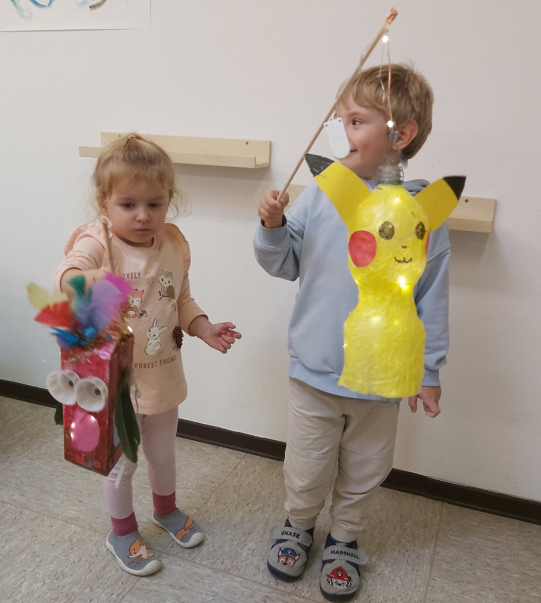 Das Bastelangebot fand gemeinsam mit den Eltern statt. Jedes Kind konnte zusammen mit einem Elternteil aus den bereitgestellten Materialien nach eigenen Vorstellungen und Ideen eine Laterne gestalten. Durch die Möglichkeit, sich frei auszuprobieren, und die Unterstützung ihrer Eltern lernten die Kinder, ihre Kreativität zu entfalten und gleichzeitig achtsam mit Materialien umzugehen. Die selbst gewählte Form und die individuell gestalteten Muster und Farben ließen jede Laterne zu einem kleinen Kunstwerk werden, das die Persönlichkeit des jeweiligen Kindes widerspiegelte. Besonders schön war es zu sehen, wie die Kinder in diesem Prozess aufblühten. Die Freude und der Stolz, wenn ihre eigenen Vorstellungen Wirklichkeit wurden und sie das Gefühl hatten, aktiv etwas zu bewirken, war deutlich spürbar.