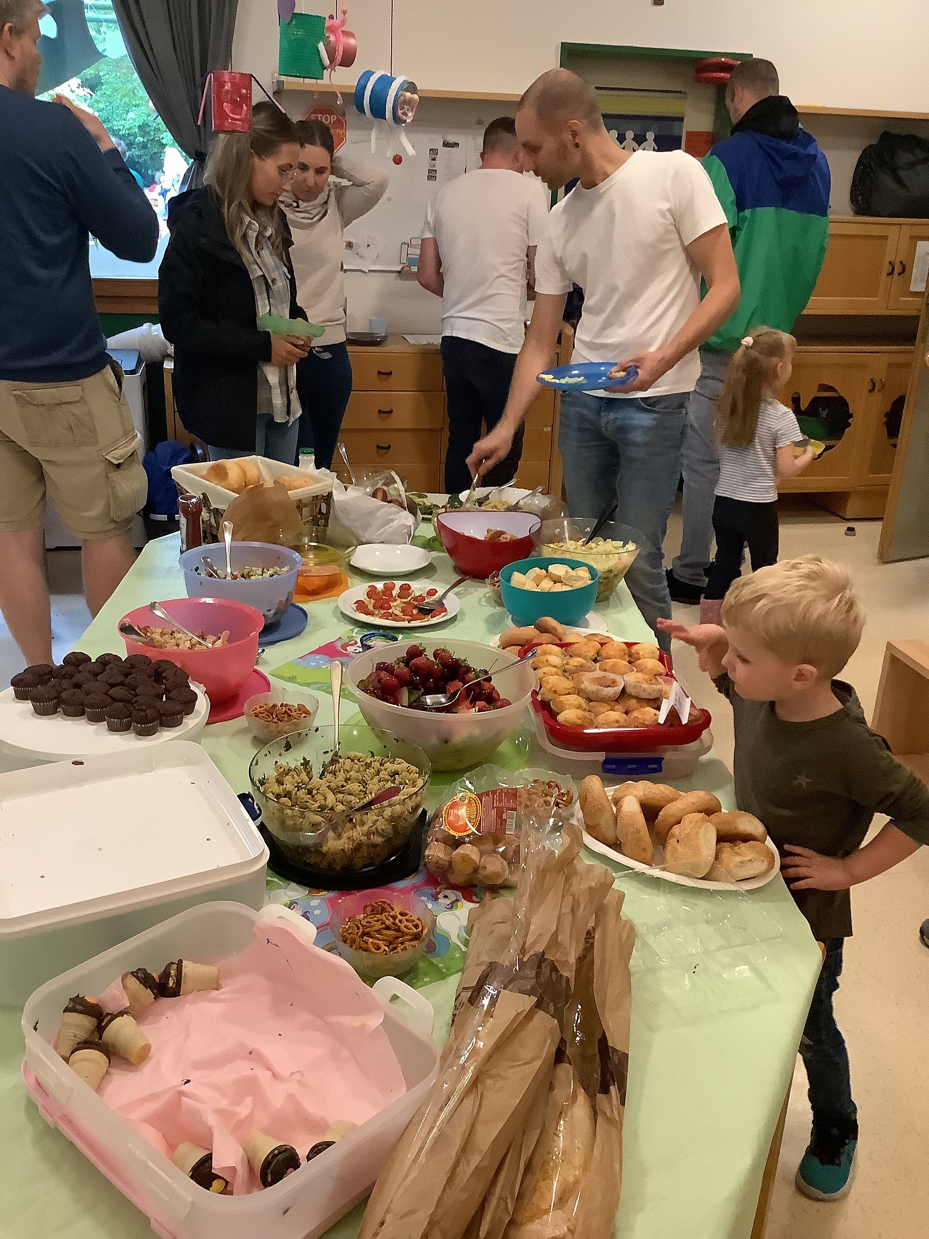 Das Wetter wurde im Verlauf des Nachmittages immer besser, so dass sich das Geschehen immer mehr nach draußen verlagerte. Hier kam unsere Köchin Waltraud mit dem Grillen von Steaks und Würstchen fast nicht mehr hinterher. Zum Glück gab es auch ein tolles Buffet, das die Familien zusammengestellt hatten und keine Wünsche offenließ.